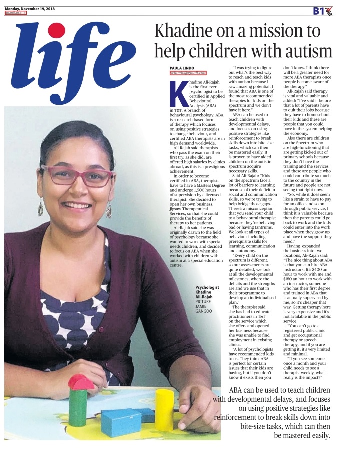 Khadine Ali-Rajah is the first ever psychologist to be certified in Applied Behavioural Analysis (ABA) in T&T. A branch of behavioural psychology, ABA is a research-based form of therapy which focuses on using positive strategies to change behaviour, and certified ABA therapists are in high demand worldwide.