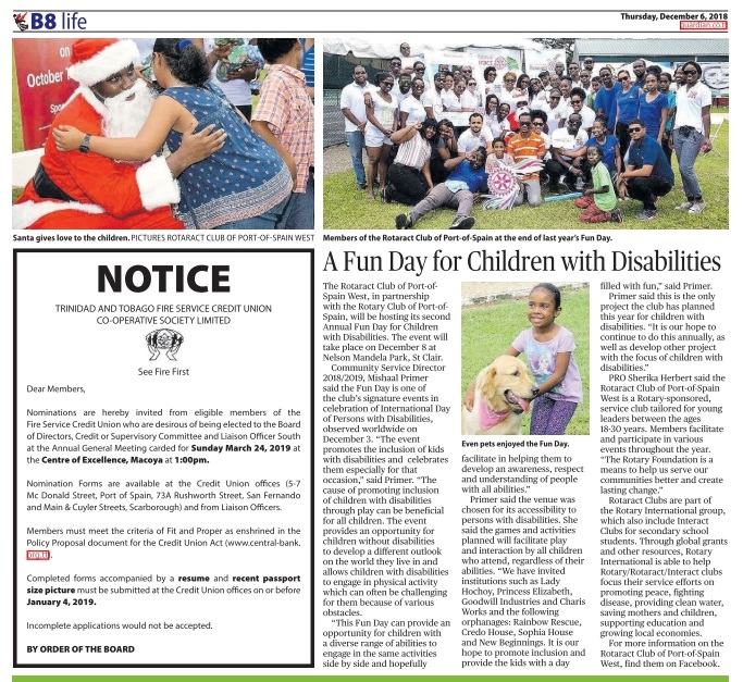 The Rotaract Club of Port-of-Spain West, in partnership with the Rotary Club of Port-of-Spain, will be hosting its second Annual Fun Day for Children with Disabilities. The event will take place on December 8 at Nelson Mandela Park.