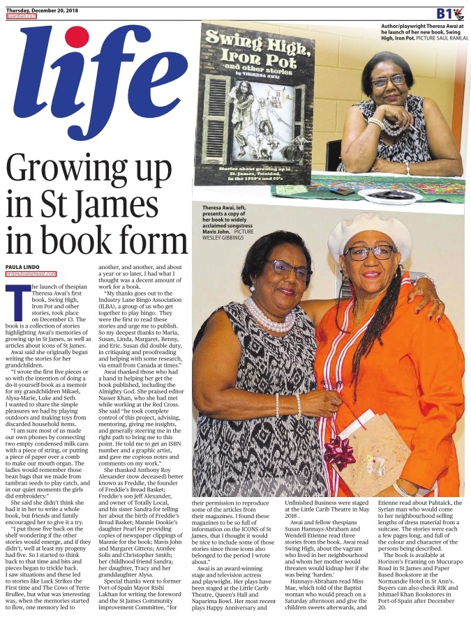 The launch of thespian Theresa Awai’s first book, Swing High, Iron Pot and other stories, took place on December 13. The book is a collection of stories highlighting Awai’s memories of growing up in St. James, as well as articles about icons of St. James.