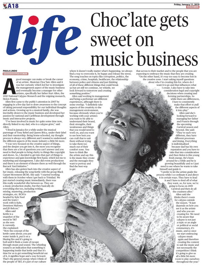 A good manager can make or break the career of an artist. Musician Choc’late Allen said it was her curiosity which led her to investigate the management aspect of the music business and eventually become a manager for other artists, specifically her father Kurt Allen and the reigning Calypso Monarch, Helon Francis.