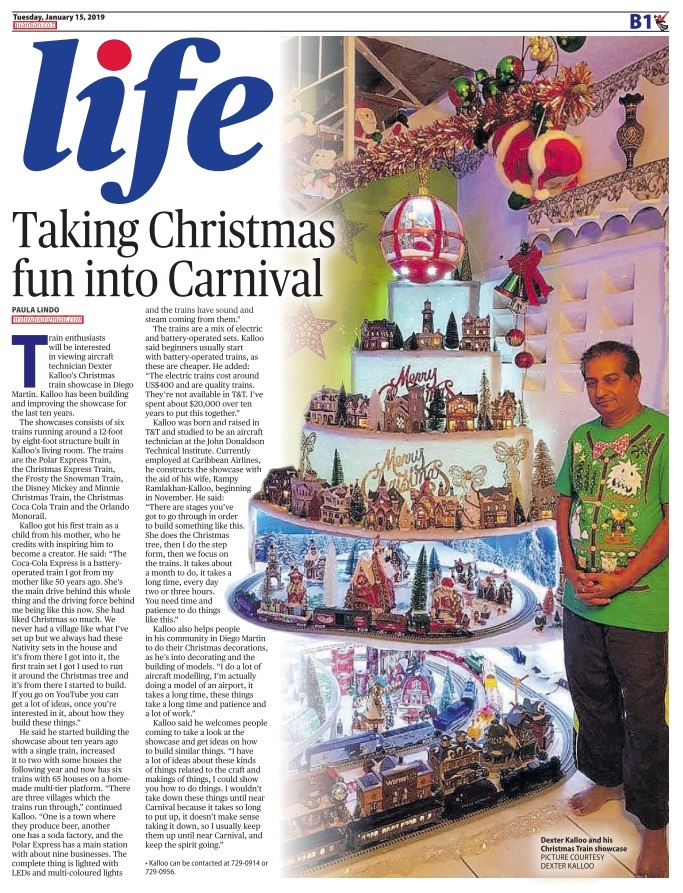 Train enthusiasts will be interested in viewing aircraft technician Dexter Kalloo’s Christmas train showcase in Diego Martin. Kalloo has been building and improving the showcase for the last 10 years.