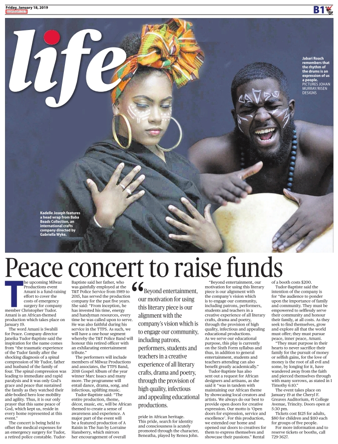 The performers will include members of Milwaz Productions and associates, the TTPS Band, 2018 Gospel Album of the year winner Marc Issacs and many more. The programme will entail dance, drama, song, and infectious, uplifting music. Tudor-Baptiste said “the entire production, theme, décor, music, etc., will be African themed to create a sense of awareness and experience. A major part of the event will be a featured production of “A Raisin in The Sun by Lorraine Hansberry”, which mirrors her encouragement of overall pride in African heritage. This pride, search for identity and consciousness is acutely promoted through the character, Beneatha, played by Renea John. Beyond entertainment, our motivation for using this literary piece is our alignment with the company’s vision which is to engage our community, including patrons, performers, students and teachers in a creative experience of all literary crafts, drama and poetry, through the provision of high quality, infectious and appealing educational productions. As we serve our educational purpose, this play is currently on the Sixth Form syllabus and thus, in addition to general entertainment, students and teachers attending can also benefit greatly academically.”