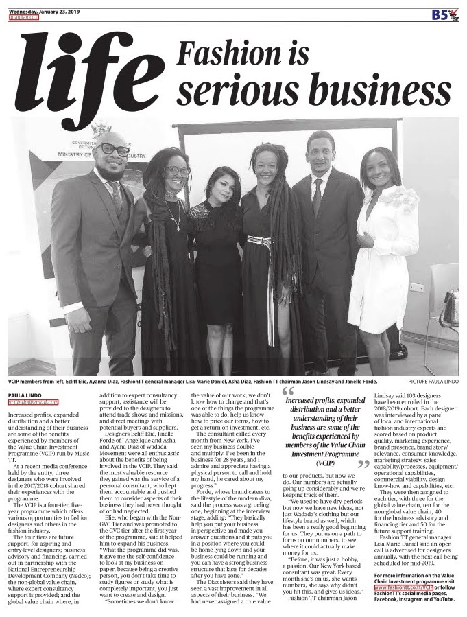 Increased profits, expanded distribution and a better understanding of their business are some of the benefits experienced by members of the Value Chain Investment Programme (VCIP) run by Fashion TT. At a recent media conference held by the entity, three designers who were involved in the 2017/2018 cohort shared their experiences with the programme.