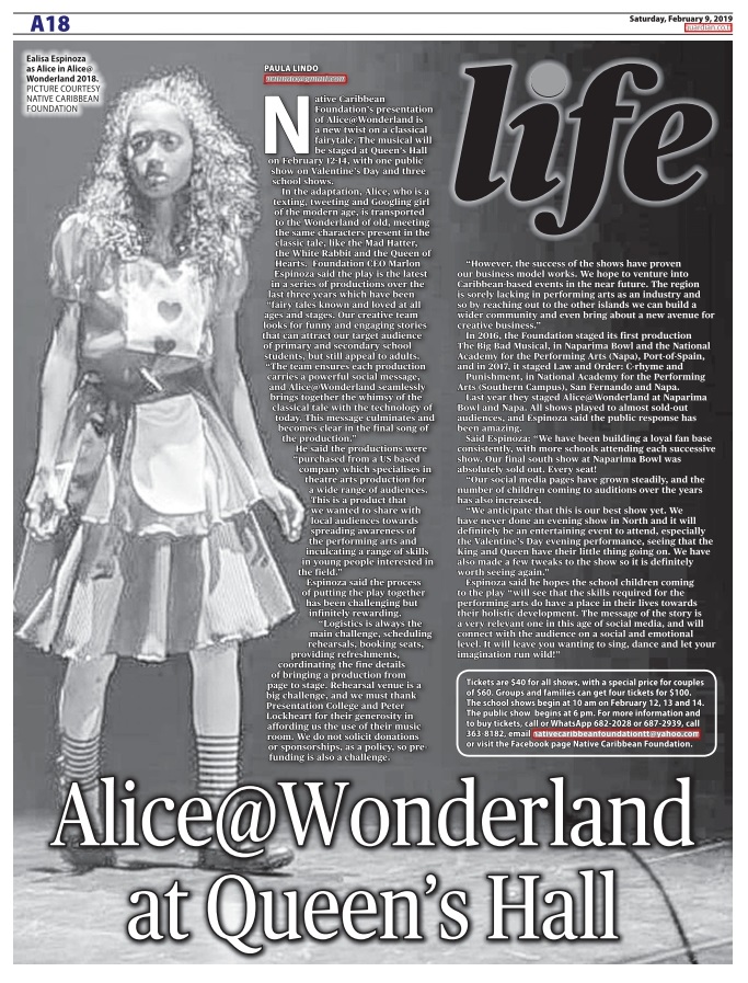 Native Caribbean Foundation’s presentation of Alice@Wonderland is a new twist on a classical fairytale. The musical will be staged at Queen’s Hall between February 12 and 14, with one public show on Valentine’s Day and three school shows.