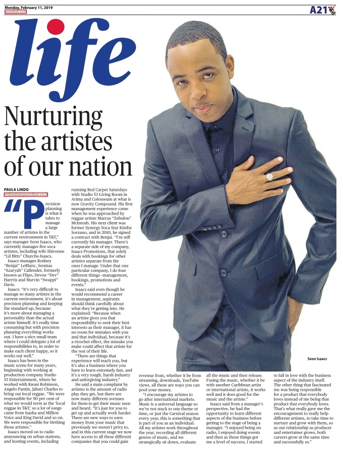 “Precision planning is what it takes to manage a large number of artists in the current environment in T&T.” Manager Seon Isaacs, who currently manages five Soca artistes, including wife Shivonne “Lil Bitts” Churche-Isaacs.