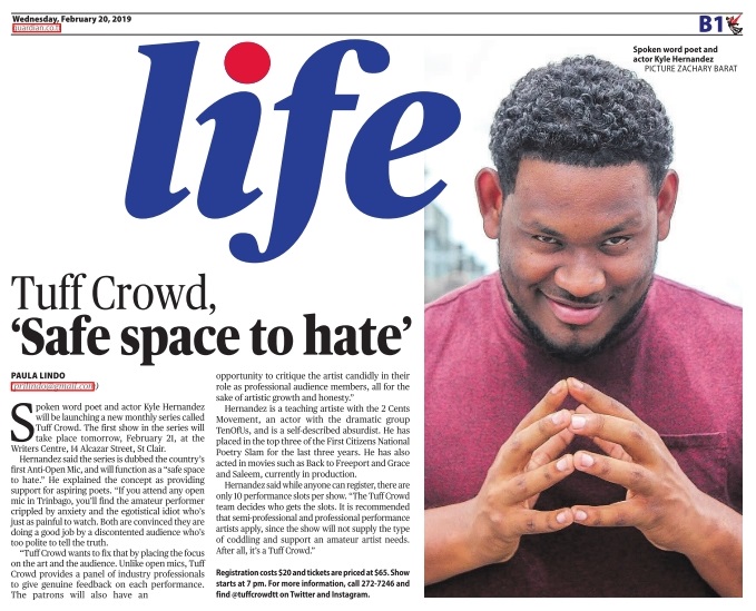 Spoken word poet and actor Kyle Hernandez will be launching a new monthly series called Tuff Crowd. The first show in the series will take place on February 21 at the Writers Centre, 14 Alcazar Street, Port-of-Spain.