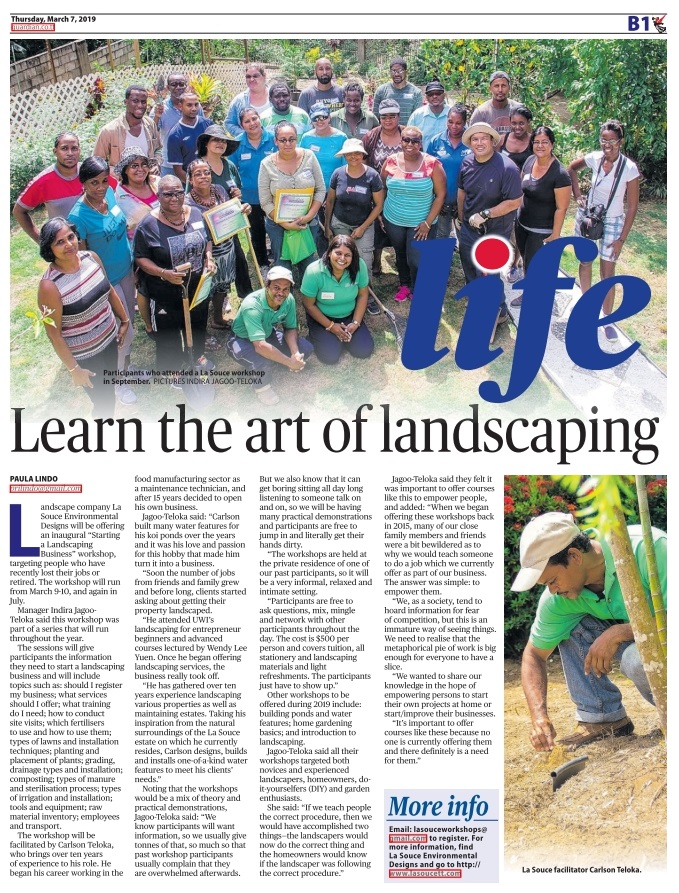 Other workshops to be offered during 2019 include: Building Ponds and Water Features; Home Gardening Basics; and Introduction to Landscaping. Jagoo-Teloka said all their workshops target both novices and experienced landscapers, home owners, do-it-yourselfers (DIY) and garden enthusiasts. She said the hope is that “if we teach people the correct procedure then we would have accomplished two things – the landscapers would now do the correct thing and the home owners would know if the landscaper was following the correct procedure.”