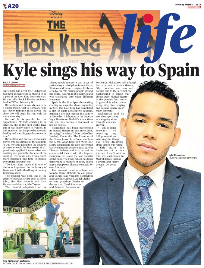 T&T singer and actor Kyle Richardson has been chosen to go to Madrid to be a part of the Lion King Musical’s cast. He was called back following auditions held in T&T on February 21.