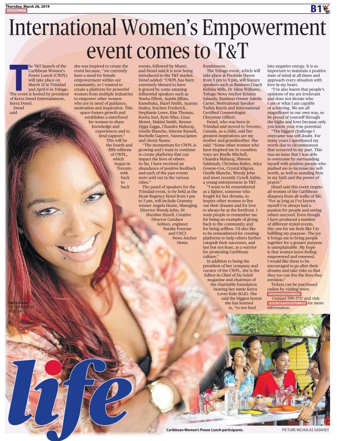This will be the fourth and fifth editions of CWPL, which began in Toronto with back to back events, followed by Miami and Denel said it is now being introduced to the T&T market. “CWPL has been extremely blessed to have it graced by some amazing influential speakers such as Nneka Elliott, Auntie Jillian, Kamshuka, Hazel Smith, Ayanna Sealey, Stachen Frederick, Stephanie Lowe, Kim Thomas, Kavita Suri, Kym Niles, Lissa Monet, Makini Smith, Reesee Zigga Zagga, Chandra Maharaj, Giselle Blanche, Simone Russell, Rochelle Gapere, Vanessa James and Alexis Nunes. The momentum for CWPL is growing and I want to continue to create platforms that can impact the lives of others. So far, I have received an abundance of positive feedback and each of the past events were sold out in the various cities.”