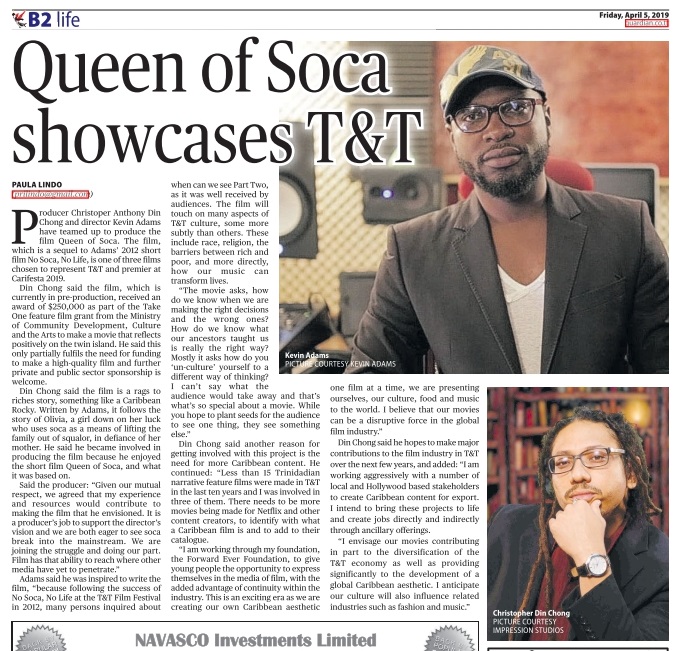 Producer Christoper Anthony Din Chong and director Kevin Adams have teamed up to produce the film Queen of Soca. The film, which is a sequel to Adams’ 2012 short film No Soca, No Life, is one of three films chosen to represent T&T and premier at Carifesta 2019.
