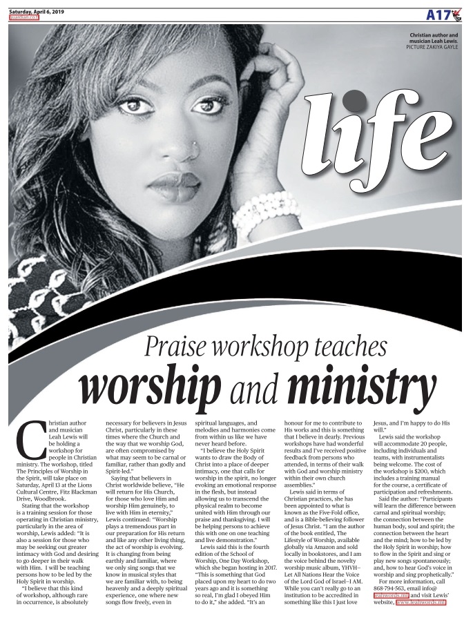 Christian author and musician Leah Lewis will be holding a workshop for persons in Christian ministry. The workshop, titled The Principles of Worship in the Spirit, will take place on April 13 at the Lions Cultural Centre, Fitz Blackman Drive, Woodbrook, Port-of-Spain.