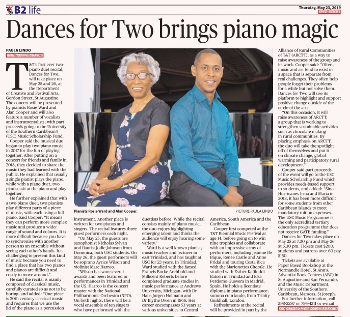 Cooper said part proceeds of the event will go to the USC Music Scholarship Fund which provides needs-based support to students. “Since Hurricanes Irma and Maria in 2018, it has been more difficult for some students from other Caribbean islands to meet mandatory tuition expenses. The USC Music Programme is the only accredited tertiary education programme that does not receive GATE funding.” Dances for Two takes place on May 25 at 7:30 pm and May 26 at 5:30 pm. Tickets cost $200, students and patrons over 60 pay $150. Tickets are available at Paper Based Bookshop at the Normandie Hotel, St. Ann’s, Adventist Book Centres (ABC) in St. Augustine and San Fernando, and the Music Department, University of the Southern Caribbean, Maracas St. Joseph. For further information, call 398 2297 or 7954311 or e-mail cooperward2piano@gmail.com.