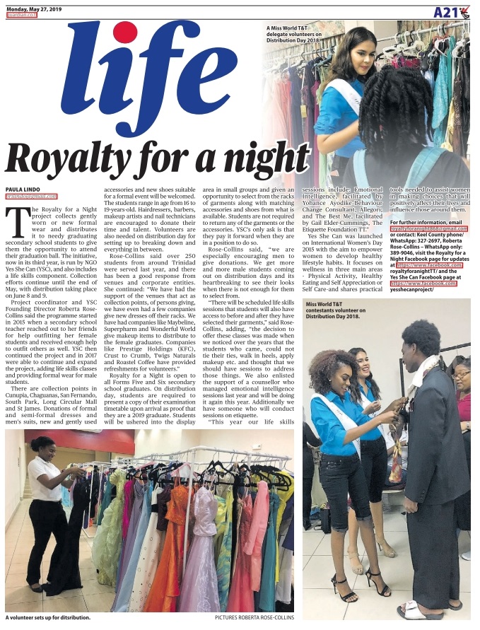 For further information, email royaltyforanight868@gmail.com or contact: Keel County phone/WhatsApp: 327-2697, Roberta Rose-Collins – WhatsApp only: 389-9046, visit the Royalty for a Night Facebook page for updates at https://www.facebook.com/royaltyforanightTT/ and the Yes She Can Facebook page at https://www.facebook.com/yesshecanproject/.