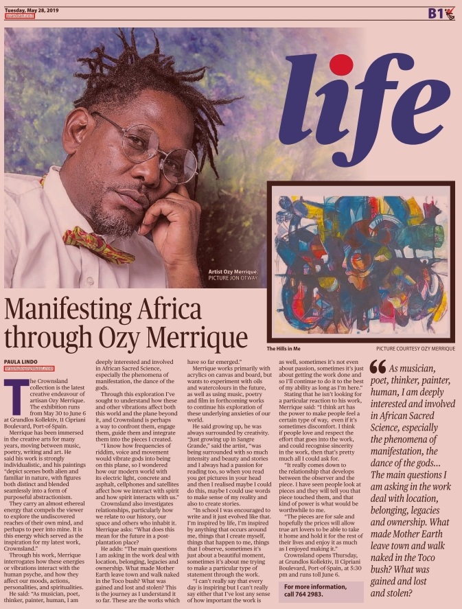 “As musician, poet, thinker painter, human, I am deeply interested and involved in African Sacred Science, especially the phenomena of manifestation, the dance of the Gods.. Through this exploration I’ve sought to understand how these and other vibrations affect both this world and the plane beyond it, and Crownsland is perhaps a way to confront them, engage them, guide them and integrate them into the pieces I created. I know how frequencies of riddim, voice and movement would vibrate gods into being on this plane, so I wondered how our modern world with its electric light, concrete and asphalt, cellphones and satellites affect how we interact with spirit and how spirit interacts with us.”