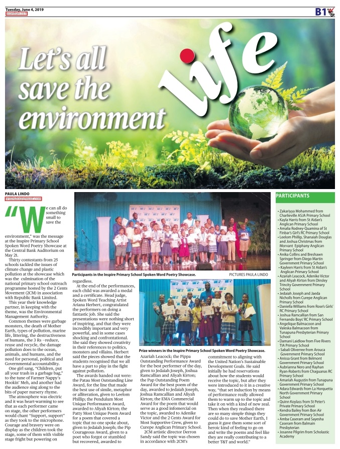 2CM Artistic Director Derron Sandy said the topic was chosen in accordance with 2CM’s commitment to aligning with the United Nation’s Sustainable Development Goals. He said initially he had reservations about how the students would receive the topic, but after they were introduced to it in a creative way, “that set induction by means of performance really allowed them to warm up to the topic and take it on with a kind of new zeal. Then when they realized there are so many simple things they could do to save Mother Earth, I guess it gave them some sort of heroic kind of feeling to go on and write the poems and feel like they are really contributing to a better T&T and world.”