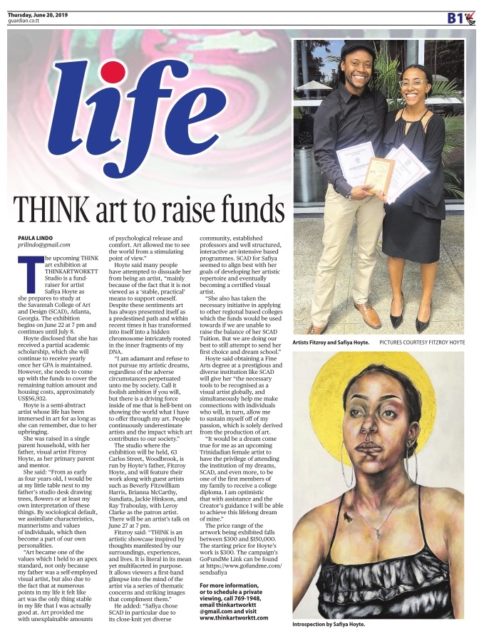 The upcoming THINK art exhibition at THINKARTWORKTT Studio is a fundraiser for artist Safiya Hoyte as she prepares to study at the Savannah College of Art and Design (SCAD). The exhibition begins on June 22 at 7 pm and continues until July 8.