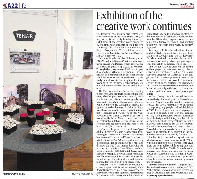 The Department of Creative and Festival Arts (DCFA) of the University of the West Indies, St. Augustine (UWI STA) is currently hosting its annual exhibition of the creative work produced by the final year students of the Fine Arts and Design disciplines within the Visual Arts Degree Programme. The exhibition can be viewed until June 29 at the National Museum and Art Gallery of T&T.