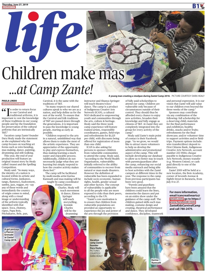 The camp will be facilitated by multi-media artist Karina Ramnath and mas-making will be taught by camp coordinator Donna Gittens-Charles. Healy will teach movement & dance, Eintou Springer will teach storytelling, Iremide Charles will be the drumming instructor and Shanya Springer will teach theatre/voice/dance. The camp is a product of Indigenous Creative Arts Network (ICAN), a cultural NGO dedicated to empowering youth and communities through the arts, culture & heritage. Healy said the three-week camp experience will feature trained artists, responsible coordinators, games, field-trips and refreshments for $1,125 per child, with discounts being offered for registration of more than one child.