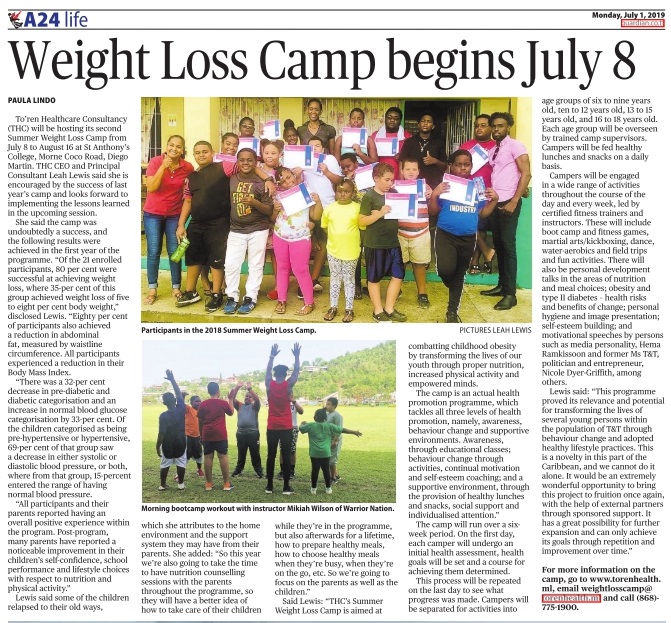To’ren Healthcare Consultancy (THC) will be hosting its second Summer Weight Loss Camp from July 8 to August 16 at St. Anthony’s College, Morne Coco Rd, Diego Martin. THC CEO and Principal Consultant Leah Lewis said she is encouraged by the success of last year’s camp and looks forward to implementing the lessons learned in the upcoming session.