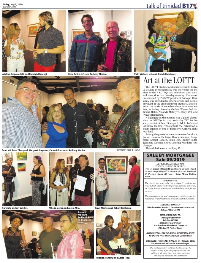 The LOFTT Studio, located above Drink! Bistro & Lounge in Woodbrook, was the venue for the first PrideTT LGTBQ+ art exhibition and cocktail reception, last Monday evening. The event was hosted by PrideTT president Rudolph Hanamji, was attended by several artists and people involved in the entertainment industry, and featured the works of a number of our prominent artists, including pieces by the late Wayne Berkeley, Stuart Hahn, Amanda McIntyre, Stacy Well and Wayde Ramnarine.