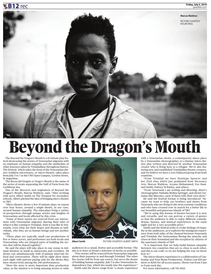 The Bocas del Dragón or Dragon’s Mouth is the name of the series of straits separating the Gulf of Paria from the Caribbean Sea. One of the directors and originators of Beyond the Dragon’s Mouth, Marcus Waldron, said, “After working with actor Albert Smith on The Tempest for secondary schools, Albert pitched the idea of bringing micro theatre to T&T. Micro-theatre shows a few 15-minute plays on repeat over four hours, around a single theme, in our case, around human empathy. The mini-plays bring a variety of perspectives through unique stories and insights of Venezuelans and locals affected by this crisis. Some of these stories are sourced from our interactions with Venezuelan migrants sharing their tales of what it is like coming to Trinidad, what it was like in Venezuela, even what are their hopes and dreams as individuals, who they are as human beings and not an othered entity. These plays are typically small cast productions of five or fewer actors, and performers are both locals and Venezuelans who are integral parts of building the stories that will be shared together.”