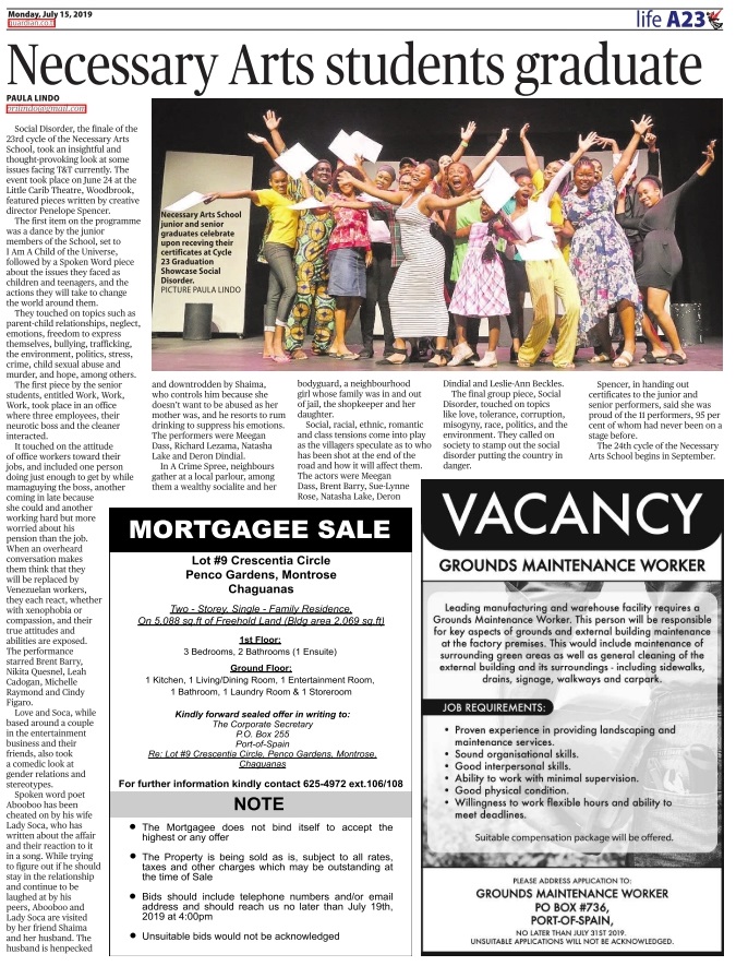 Social Disorder, the finale of the 23rd cycle of the Necessary Arts School, took an insightful and thought-provoking look at some issues facing T&T currently. The event took place on June 24 at the Little Carib Theatre and featured pieces written by Creative Director and thespian Penelope Spencer.