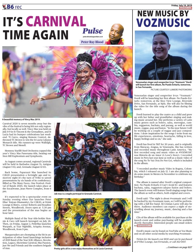 Venezuelan singer and songwriter Irvys “Vozmusic” Dordi will be launching her first album No Puedo Evitarlo on July 20 at the Skyy View Lounge in San Fernando. She will also be filming the video for the title song of the album during the launch.