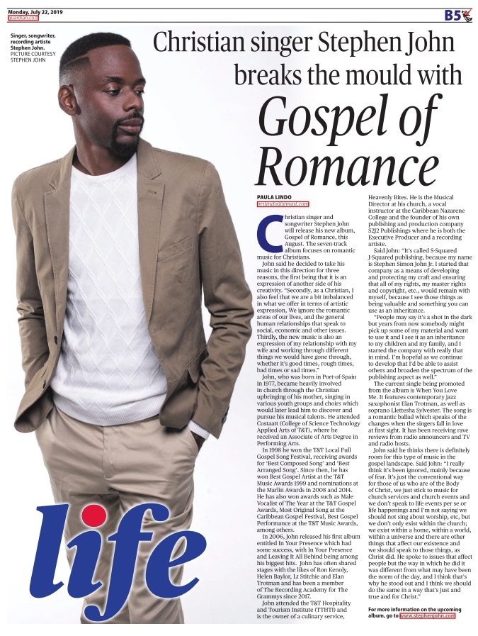 John attended the T&T Hospitality and Tourism Institute (TTHTI) and is the owner of a culinary service, Heavenly Bites. He is the Musical Director at his church, a vocal instructor at the Caribbean Nazarene College and the founder of his own publishing and production company S2J2 Publishings where he is both the Executive Producer and a recording artist. “It’s called S-Squared J-Squared publishing, because my name is Stephen Simon John Jr. I started that company as a means of developing and protecting my craft and ensuring that all of my rights, my master rights and copyright, etc., would remain with myself, because I see those things as being valuable and something you can use as an inheritance. People may say it’s a shot in the dark but years from now somebody might pick up some of my material and want to use it and I see it as an inheritance to my children and my family, and I started the company with really that in mind. I’m hopeful as we continue to develop that I’d be able to assist others and broaden the spectrum of the publishing aspect as well.”